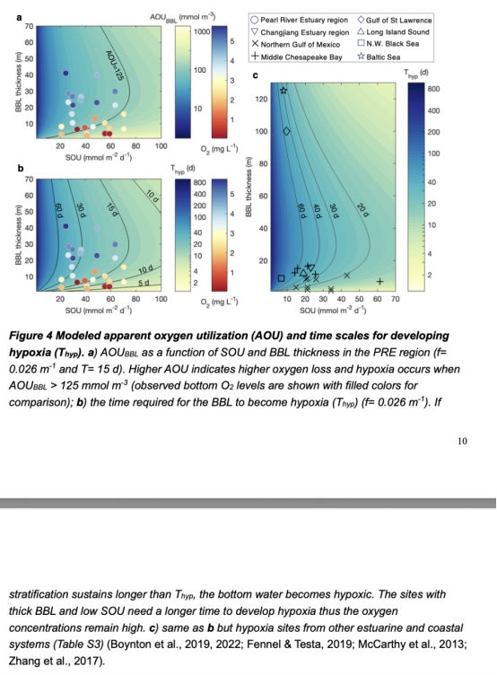 (3)質量平衡模型成功量化缺氧形成時間(圖4b-c),并解釋跨系統差異(如墨西哥灣缺氧時間更長)。