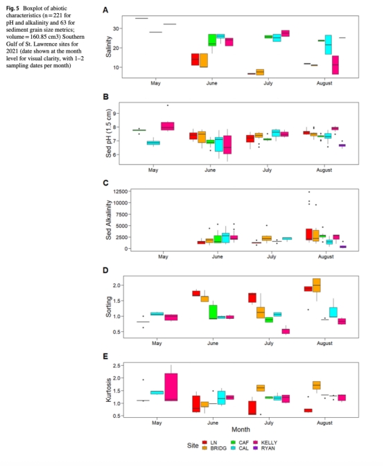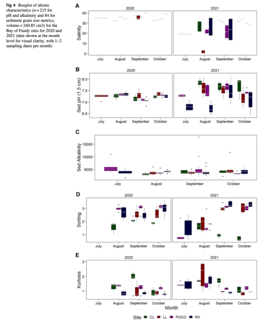 該研究探討了水體(如鹽度、溫度)和沉積物(如粒度、碳酸鹽化學參數)的非生物條件對潮間帶底棲無脊椎動物群落及雙殼類幼體豐度的影響。研究區域位于加拿大新不倫瑞克省的兩個海洋環境差異顯著的區域——芬迪灣(高潮差)和圣勞倫斯灣南部(低潮差)。通過2020-2021年的數據,采用多變量和單變量統計模型分析發現,碳酸鹽化學參數(沉積物pH、水體/沉積物堿度)是解釋底棲群落組成和生物指標(物種豐富度、總豐度、雙殼類豐度)的重要驅動因素。在芬迪灣,沉積物pH解釋了16.9%的群落變異,而在圣勞倫斯灣南部,鹽度是主要驅動因素(9.8%)。研究指出,未來海洋酸化可能通過改變碳酸鹽化學條件(如pH和堿度)顯著影響底棲生物群落。