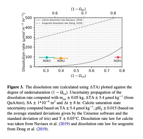 該研究通過實驗室實驗和模型模擬,探究了文石(aragonite)在海底溶解時對方解石(calcite)溶解的緩沖效應。研究發現,當文石溶解于方解石沉積物中時,其釋放的堿性物質會提高局部pH值和碳酸鹽濃度,從而減緩甚至抑制方解石的溶解。這一現象被稱為“深海的碳酸鹽電偶保護效應”(galvanization)。研究結合pH微剖面測量和成巖模型,揭示了文石溶解對海底碳酸鹽循環的關鍵作用。