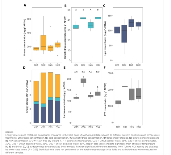 軟珊瑚在高溫下脂質和碳水化合物增加(圖4B-C),但ATP減少41%(圖4F);石珊瑚碳水化合物增加但ATP穩定(圖5B-F)。