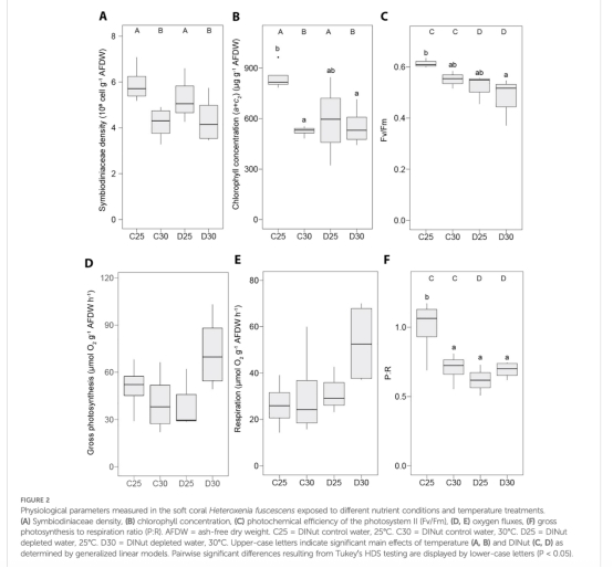 光合與呼吸速率:高溫下軟珊瑚光合作用未下降但呼吸增加,P:R降低(圖2F);石珊瑚在高溫+營養缺乏時P:R最低(圖3F)。