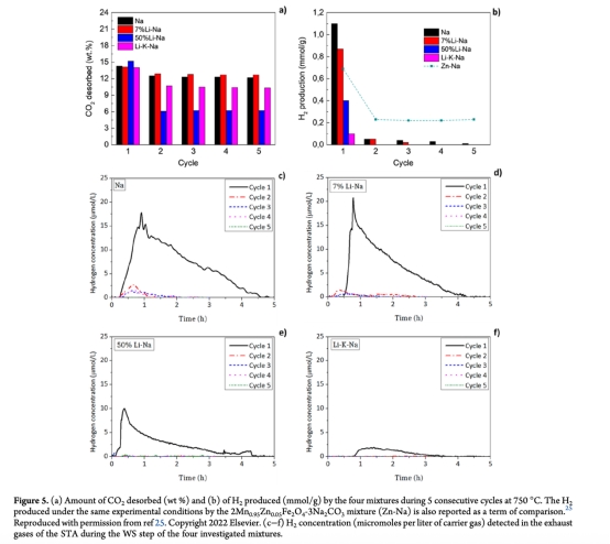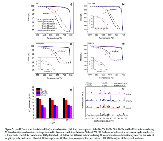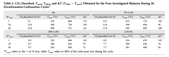 純Na混合物在20次非氧化循環(huán)中保持13 wt% CO?釋放量,而50% Li-Na和Li-K-Na僅釋放8.3 wt%和6.9 wt%。