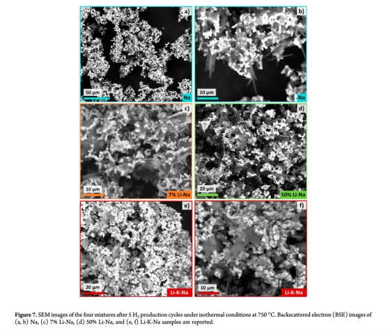循環(huán)衰減機制:氫氣產(chǎn)量隨循環(huán)次數(shù)驟降(如Na在第五循環(huán)僅產(chǎn)0.01 mmol/g),結(jié)合XRD/SEM數(shù)據(jù),明確燒結(jié)與非化學計量相生成是主因。
