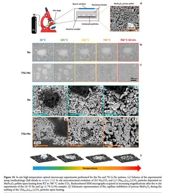 原位光學顯微術(shù):觀察熔融碳酸鹽對多孔MnFe?O?的潤濕行為(圖10)。