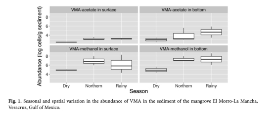 甲醇利用型VMA(VMA-M)豐度為10?–10? MPN/g,雨季和北風季顯著高于干燥季。