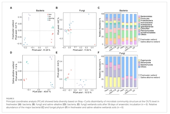 研究通過淡水濕地(富碳鐵)和鹽堿濕地(貧碳鐵)的厭氧培養實驗,探究赤鐵礦(Hem)和褐煤(Lig)添加對土壤有機碳平衡的影響。結果表明:Lig通過促進鐵結合有機碳(Fe-OC)形成導致凈碳積累(淡水濕地:5.9±3.6 mg g?1;鹽堿濕地:8.3±3.2 mg g?1),而Hem通過改變微生物群落結構顯著增加有機碳礦化(尤其在淡水濕地)。結晶態鐵氧化物單獨添加會增強碳礦化,但老碳(富含芳香族和烷基化合物)能促進Fe-OC形成并提高碳持久性。