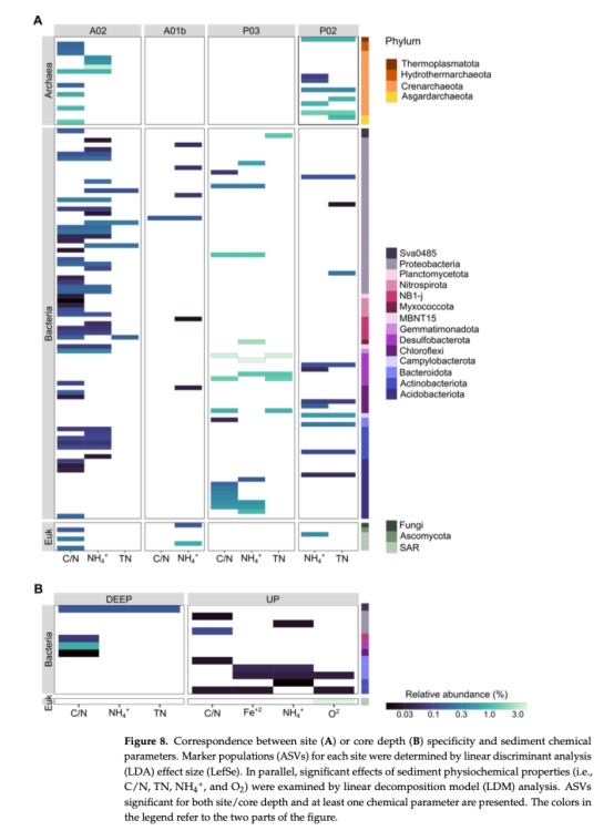 化學參數(C/N比、NH4+濃度)與特定微生物類群顯著相關(如Desulfobacteria與高C/N比沉積物)。