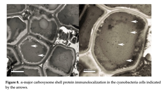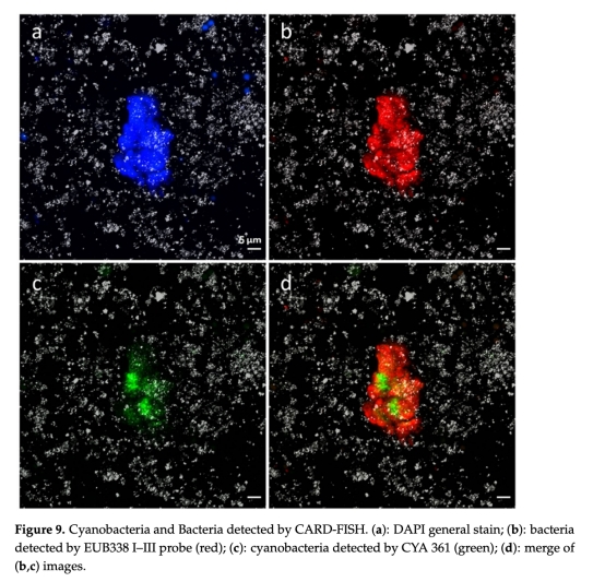微生物結(jié)構(gòu)與多樣性分析:利用掃描電鏡(SEM,圖4-5)、透射電鏡(TEM,圖6-8)觀察細胞超微結(jié)構(gòu);通過免疫定位(α-羧酶體蛋白)和熒光原位雜交(CARD-FISH,圖9)確認藍藻存在。