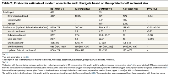 全球陸架貢獻Re匯占河流輸入的100±41%,U匯超所有已知匯總和108±42%(表2),成為主導匯項。