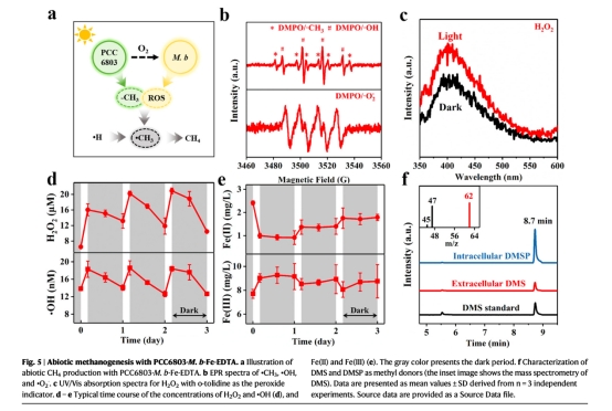 該過程依賴光合產物(有機物、O2、ROS)和鐵介導的氧化還原反應,挑戰了傳統厭氧產甲烷理論。