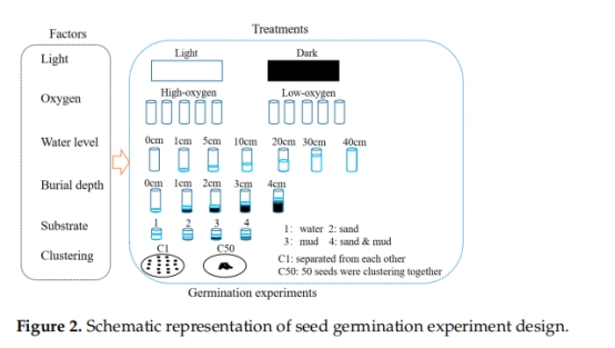 研究思路1. 萌發(fā)實驗:單因素設(shè)計,分別測試光、氧、水位(0–40 cm)、埋深(0–4 cm)、基質(zhì)(水、沙、泥、混合)及密度(單粒vs. 50粒)對萌發(fā)率的影響(圖2)。