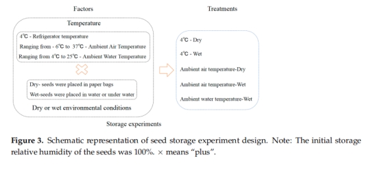2. 儲存實驗:比較5種儲存條件(4°C干/濕、常溫干/濕、環(huán)境水溫濕沙)對種子活力(萌發(fā)率)、水分含量及呼吸速率的影響(圖3)。