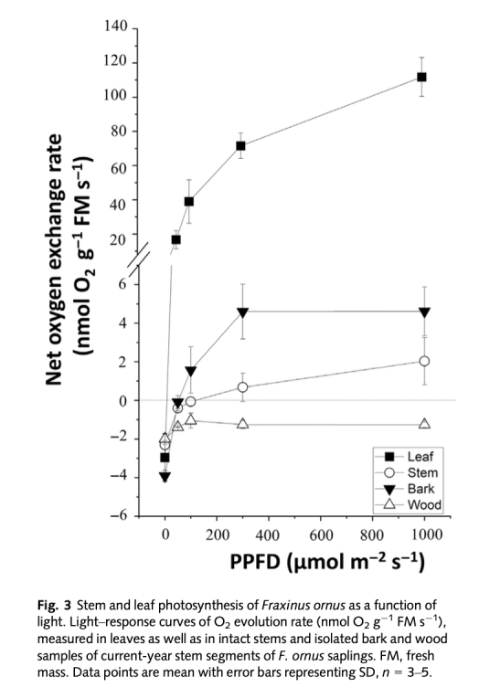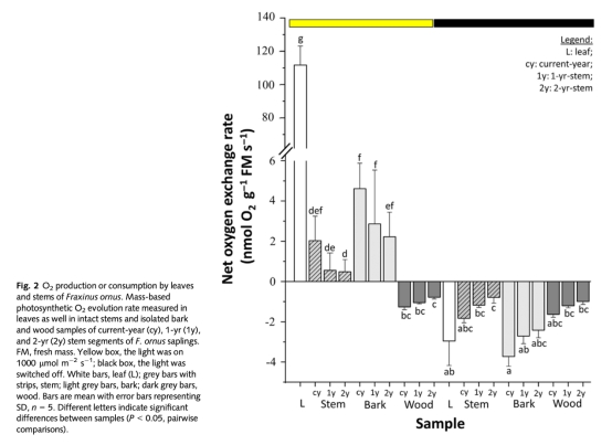 光照下當年生莖整體凈氧氣產量為2.0 nmol O2/g FM/s,樹皮貢獻主要部分(1.2 nmol O2/g FM/s),木材光合作用僅補償其呼吸消耗的20%。