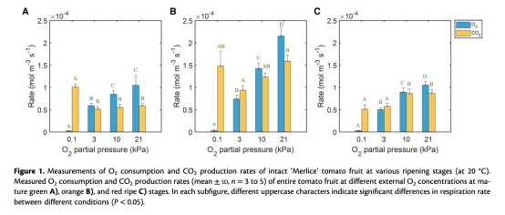 完整果實(shí)的呼吸速率(圖1):測量了不同成熟階段(綠熟、橙熟、紅熟)在不同外部氧氣濃度下的氧氣消耗和二氧化碳生成速率。意義:揭示呼吸速率的階段性變化及其對缺氧的敏感性。