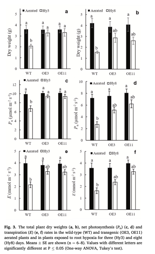 該研究通過過表達煙草的NtPIP1;3基因(一種推測參與氧氣運輸的質膜水通道蛋白)于油菜(甘藍型油菜),探究其在根低氧脅迫下的生理和代謝響應。結果顯示,轉基因植株在淹水脅迫下維持了更高的生物量、光合速率、根水導度、根氧濃度、葉片水勢、根系呼吸速率和ATP水平。代謝分析表明轉基因植株通過調控糖酵解、丙酮酸代謝和三羧酸循環(TCA cycle)增強有氧代謝?;虮磉_分析顯示,轉基因植株的缺氧信號通路基因(如RAP2.12、PCO1/2)表達模式與野生型不同,結合直接測量的根氧濃度數據,證實NtPIP1;3通過促進根系氧供應增強低氧耐受性。