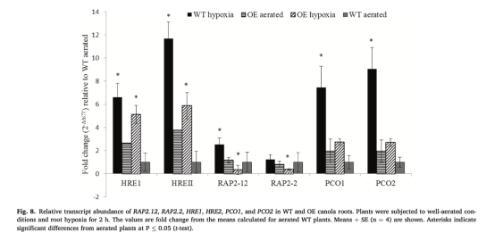 轉基因植株的缺氧信號基因(RAP2.12、PCO1/2)表達模式與WT差異顯著,反映氧氣供應改善。