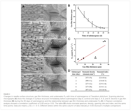 研究探討了耐洪樹種落羽杉(Taxodium distichum)在水下光合作用的響應機制。通過30天的完全淹沒實驗,測量了其水下凈光合速率(PN)、針葉疏水性、氣膜厚度、葉綠素濃度及解剖結構變化,并構建了水下PN對CO2、光照和溫度的響應曲線。研究發現,盡管氣膜厚度和葉綠素濃度隨淹沒時間顯著下降導致PN降低,但即使淹沒30天后仍保留部分光合能力。氣膜的保留(初始厚度35μm)可提升2倍光合速率,但長期淹沒導致氣膜消失,同時針葉柵欄組織降解。
