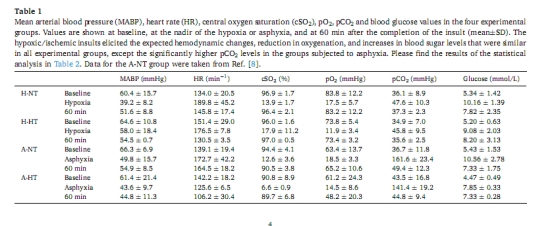 在常溫缺氧(H-NT)中,pHbrain(5.93)與pH?(7.24)差異達1.31單位,而窒息(A-NT)差異為0.88單位(pHbrain 5.90 vs pH? 6.78)。這種梯度提示血腦屏障對H?/CO?擴散的調控作用,低溫可能通過減少乳酸跨屏障轉運減輕酸中毒(H-HT梯度縮小)。