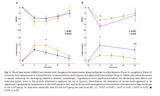低溫效應:顯著降低窒息組的乳酸積累(A-HT乳酸峰值7.85 vs A-NT 10.56),但對缺氧組無顯著改善。