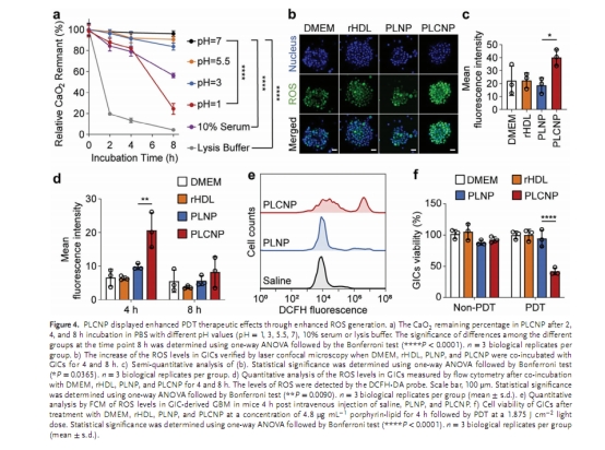 ROS水平:PLCNP處理的GBM細(xì)胞ROS強(qiáng)度是PLNP的2.1倍(圖4d)。