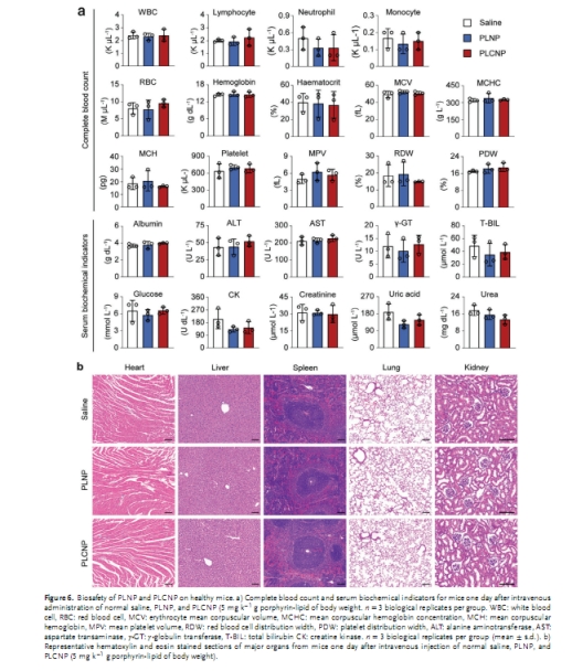安全性與臨床潛力:低劑量(5 mg/kg卟啉脂質(zhì))即可顯著延長(zhǎng)生存期,且無顯著毒性(圖6)。