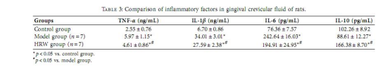 表3顯示齦溝液中HRW組IL-10水平(166.38±8.70 pg/mL)高于模型組(88.61±12.27 pg/mL)。