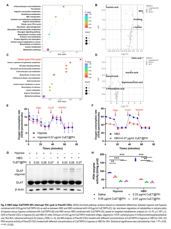 體外實(shí)驗(yàn):在缺氧、常氧和HBO條件下,分析CuET@PH NPs對(duì)PDAC CSCs代謝通路(糖酵解/OXPHOS)的影響(圖3-5)。