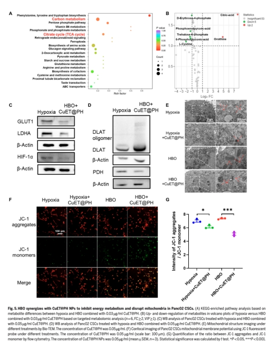 摘要指出銅死亡(cuproptosis)納米藥物在胰腺導(dǎo)管腺癌(PDAC)治療中因癌癥干細(xì)胞(CSCs)的缺氧微環(huán)境和糖酵解代謝而受限。研究通過高壓氧(HBO)克服腫瘤缺氧,將CSCs代謝從糖酵解重編程為氧化磷酸化(OXPHOS),同時(shí)利用銅-二乙基二硫代氨基甲酸酯納米顆粒(CuET@PH NPs)靶向三羧酸(TCA)循環(huán)蛋白誘導(dǎo)銅死亡。體外和體內(nèi)實(shí)驗(yàn)表明,HBO與CuET@PH NPs聯(lián)用顯著抑制CSCs能量代謝,清除CSCs,并有效抑制腫瘤生長和延長生存期。