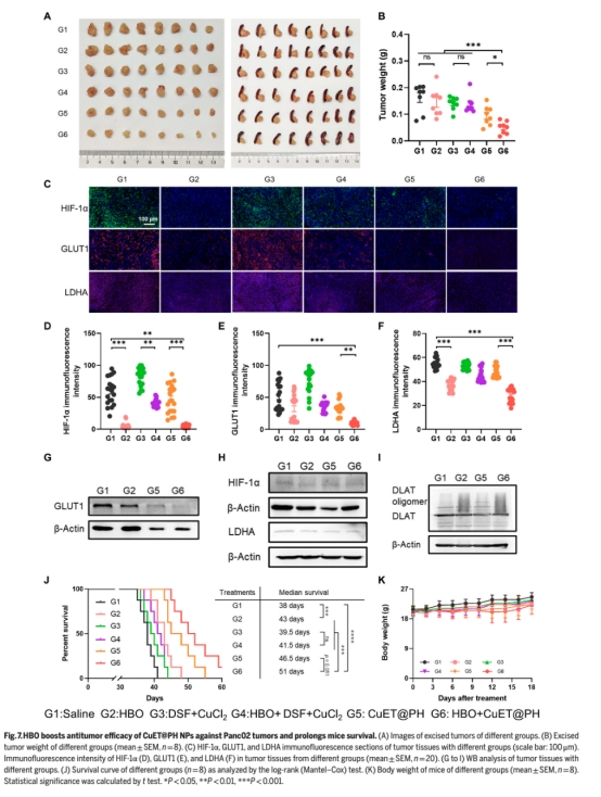 協(xié)同下調(diào)HIF-1α/GLUT1/LDHA蛋白(圖7C-G如下),延長小鼠中位生存期(圖7J如下)。