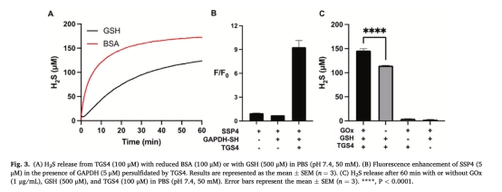 意義:證明TGS4是高效的H?S供體,尤其在生理濃度GSH(mM級)或蛋白質硫醇(BSA)存在時釋放更顯著,為理解其在生物環境中的行為提供依據。