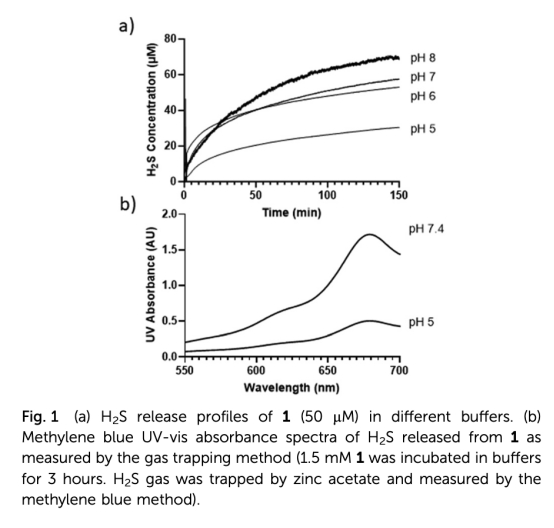 揭示pH依賴性機(jī)制:數(shù)據(jù)顯示H?S釋放量隨pH升高而增加(pH 5: 30 μM → pH 8: 68 μM),支持1通過堿促進(jìn)的消除反應(yīng)生成H?S和硫酮5的路徑(Scheme 3),為優(yōu)化供體效率提供參數(shù)指導(dǎo)。