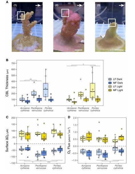 物種差異:CBL厚度最小的是A. cytherea,P. verrucosa在黑暗中最缺氧且氧通量最高。