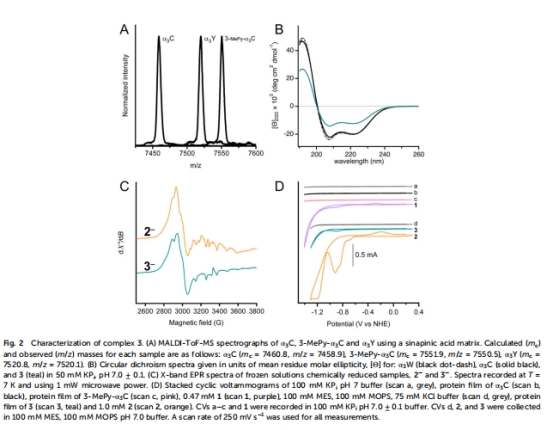驗證鈷肟結合(質譜、UV-Vis)、蛋白折疊(圓二色譜)、鈷價態(EPR)及電化學行為(循環伏安)。