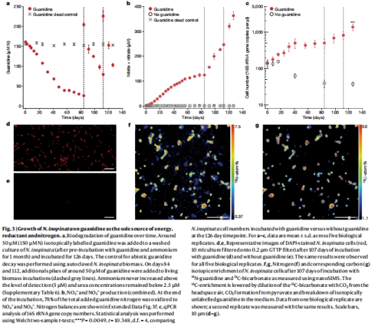 發(fā)現(xiàn):首次證實(shí)完全氨氧化菌(comammox)Nitrospira inopinata 能以胍(guanidine)作為唯一能源、電子供體和氮源實(shí)現(xiàn)化能自養(yǎng)生長(圖3f,g)。