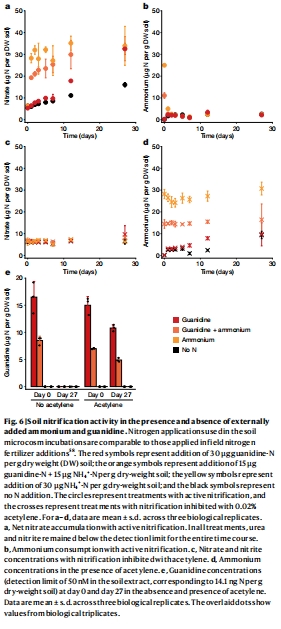 農(nóng)業(yè)土壤:胍在硝化活性土壤中被氧化為硝酸鹽,且被乙酰炔抑制(圖6e)。