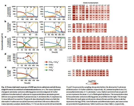 β-AOB中尿素操縱子持續高表達,amt(氨轉運蛋白)被抑制(圖4d)。
