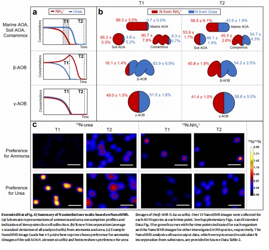β-AOB同化的氮主要來自尿素(>80%),而非胞外氨(擴展數據圖4b-c)。