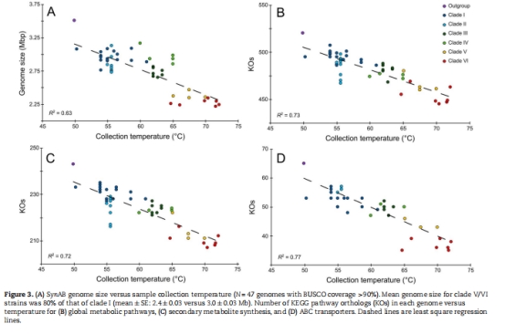 嗜熱藍藻Synechococcus A/B(SynAB)的基因組進化不符合傳統(tǒng)嗜熱微生物適應模型。盡管更耐熱的菌株基因組更小,但這與細胞大小無關,而是與群落復雜性和代謝多樣性降低相關。水平基因轉移(HGT)作用有限,但最耐熱菌株(>70°C)獲得了一個來自Thermus的tRNA修飾酶(TrmH),可能穩(wěn)定高溫翻譯。核苷酸組成與耐熱性無關,但氨基酸組成顯示天冬氨酸(Asp)被谷氨酸(Glu)系統(tǒng)性替代("天冬氨酸恐懼癥")。此外,高溫菌株的碳固定能力比放氧作用更易受熱抑制,暗示存在除CO?外的電子匯。