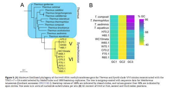 HGT作用有限:僅trmH(tRNA修飾酶)轉移顯著,可能穩(wěn)定高溫翻譯(Fig. 4, 5)。