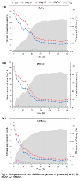 NIMCSC系統TN去除率89.75%(出水TN=1.49 mg/L),較IMCSC(82.29%)和MCSC(75.68%)顯著提升。