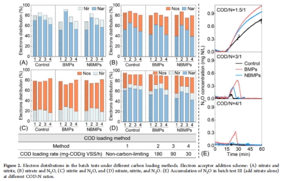 N?O積累動態 圖2E 證明低COD:N時BMPs顯著增加N?O排放(峰值比NBMPs高15%)。