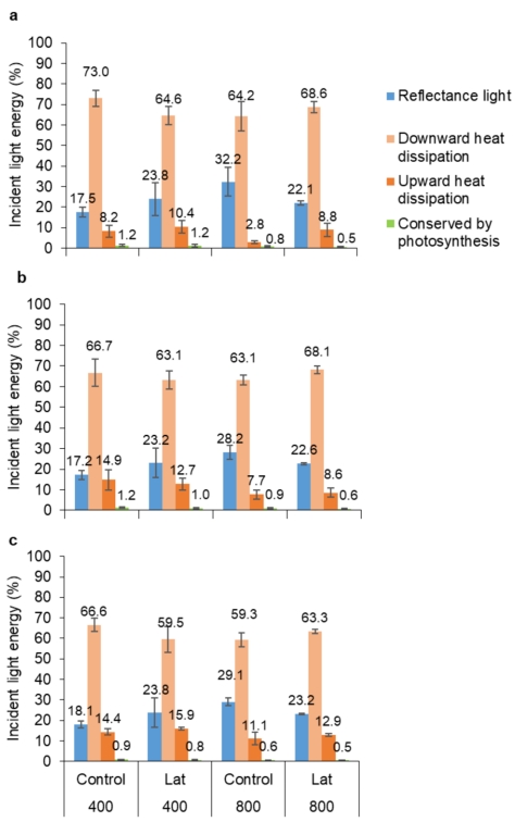 反射光能恒定(~23%),光合轉化效率低(0.5–1.2%),熱能主導(76–78%),且主要向下耗散(JH-down >59%)。