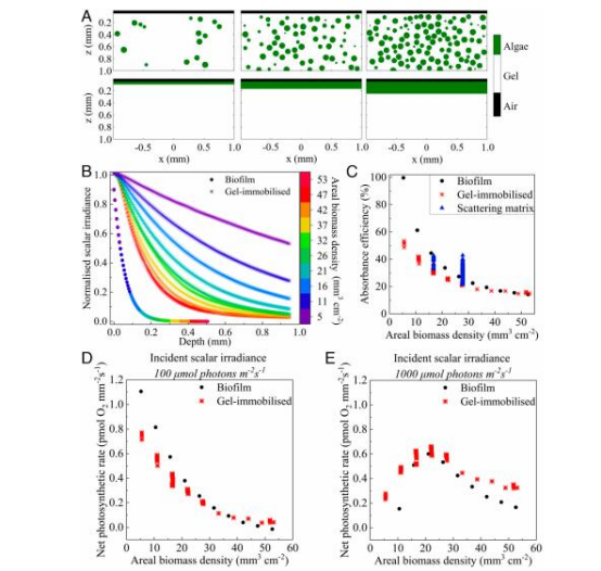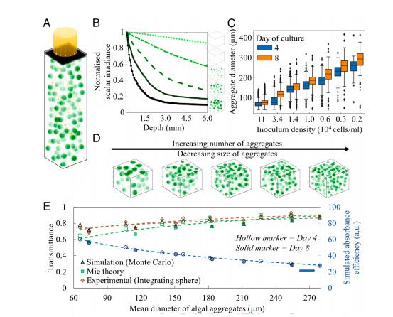 通過蒙特卡洛模擬和實驗驗證(積分球透射率測量、共聚焦顯微鏡聚集體分析),證明異質聚集體分布比均質生物膜更有效提升光合效率。