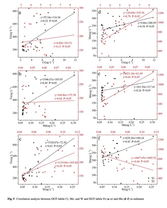 Cr、Mo、W的遷移受鐵錳氧化物還原溶解控制:DGT有效態濃度與Fe/Mn顯著正相關(圖5a-f),且還原層(-12mm)出現同步峰值(圖3)