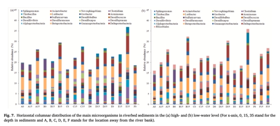 群落組成(圖7):枯水期河心區表層微生物相對豐度降低(如E點從22.78%降至19.41%)。