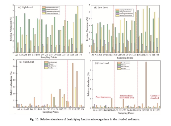 功能菌豐度(圖10-12):反硝化菌(Pseudomonas)在近岸區枯水期增加,鐵錳還原菌(Geobacter)在河心區減少。