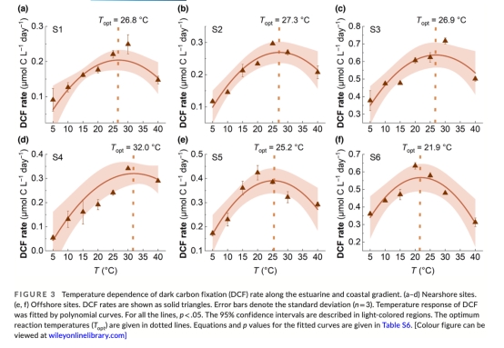 數據:不同溫度下DCF速率(0.05–0.72 μmol C L?1 day?1)及Topt(近岸站點26.8–32.0°C,離岸站點21.9–25.2°C)。