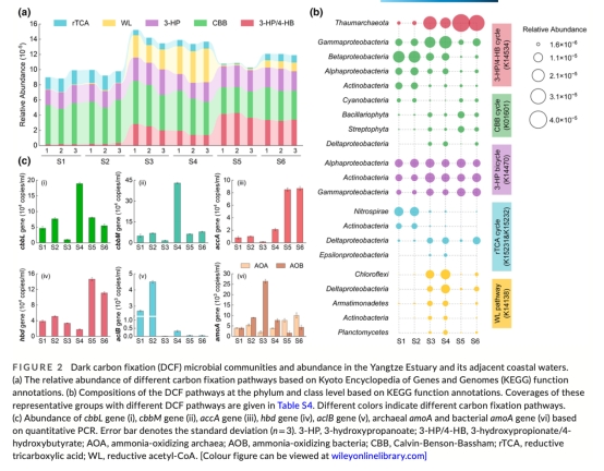 數據:近岸以CBB循環為主(Gammaproteobacteria主導),離岸以CBB和3-HP/4-HB循環共存(Thaumarchaeota主導);accA基因在離岸富集。