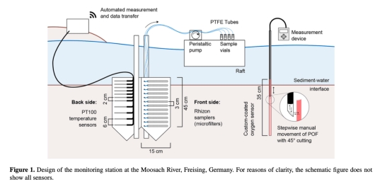 站點設計:在細粒沉積河床(70%粉砂)安裝含15個Rhizon采樣器(垂向分辨率3cm)的監測站,輔以光纖氧傳感器和14個溫度傳感器(圖1)。