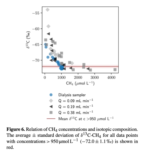 CH?濃度和δ13C-CH?顯著受抽水速率影響:速率越高(0.09 → 0.38 mL/min),CH?濃度變異性越大(標準差420 → 1119 μmol/L),且δ13C-CH?分餾加劇(圖3c, i)。
